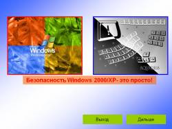 Презентация по информатике предназначена для учеников 11 класса. В ней рассказывается про безопасность в Windows. Ученики узнают про способы безопасной работы в операционной системеWindows XP, познакомятся с встроенными средствами безопасности. Также из презентации ребята узнают про безопасность при работе в сети интернет, а также смогут познакомиться с прикладными программами для защиты. В конце презентации по информатике ученикам 11 класса предлогается пройти тест по теме.