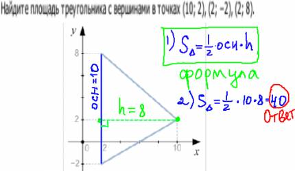 В этой геометрической задаче под номером B3, мы сперва находим основание и высоту треугольника; по координатам рисунка видно, что высота будет от 2 до 10, т.е. h=8, основание будет от -2 до 8. т.е. 10. Подставим эти числа в формулу площади треугольника S=(1/2)*осн*h=(1/2)*10*8=40.