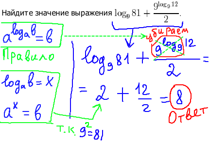 Простой пример на логарифмы, нужно вспомнить свойство, благодаря которому 9log9 убирается и останется в числителе дроби число 12. Используя 2-ое свойство логарифмов, вместо log981 получим число 2, т.к. 92=81. В итоге ответ будет таким: 2+12/2=8.