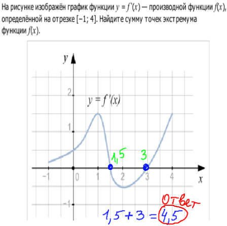 В этом задании ЕГЭ по математике мы смотрим на график производной функции f'(x) и отмечаем на оси OX точки экстремума функции f(x) при y=0: т.е. числа 1,5 и 3. Тогда их сумма будет равна 1,5+3=4,5.