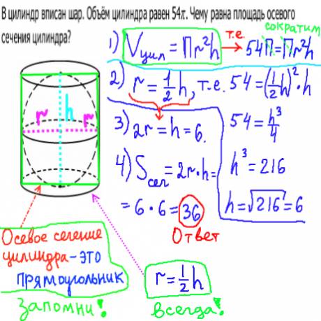 В геометрической задаче B9 дан шар, который вписан в цилиндр. Вначале мы вспоминаем формулу объема цилиндра V=Пr2h, подставляем вместо V число 54П, где числа Пи сократятся с обеих сторон. Затем по рисунку видим, что в высоте h содержится 2 радиуса r, т.е. r=(1/2)*h, подставим в формулу вместо r2 выражение ((1/2)*h)2, найдем высоту h равную 6. Значит радиус равен 6/2=3. В конце решения найдем площадь осевого сечения цилиндра (это прямоугольник), S=2r*h=6*6=36.