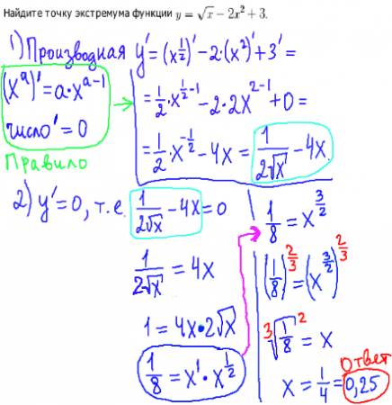 Стандартная задача егэ B14 с простым решением, сперва находим производную функции по правилу (свойству), а затем приравниваем ее к нулю. Решаем уравнение, в конце возведем обе части уравнения в степень (2/3), чтобы получился просто x. Ответ равен 1/4 или 0,25.