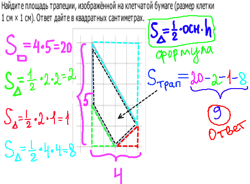 В геометрической задаче ЕГЭ под номером B3 требуется найти площадь трапеции. Здесь мы достроим трапецию до прямоугольника, найдем площадь прямоугольника 4*5=20. Затем найдем площади трех треугольников по формуле S=1/2*основание*высота. Далее из площади прямоугольника вычтем площади треугольников: 20-2-1-8=9.