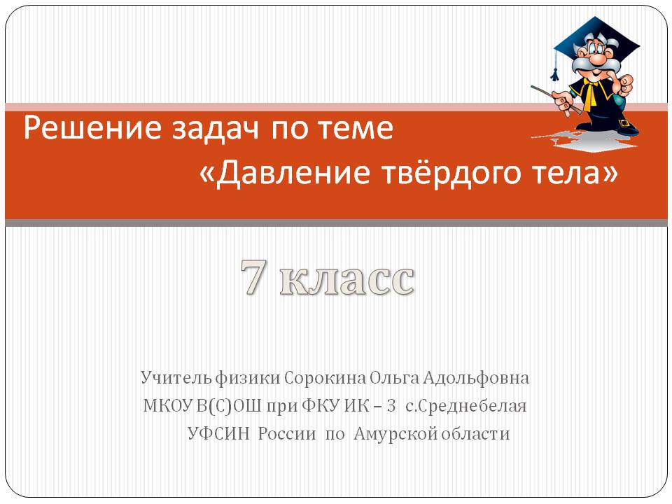 Презентация по физике 7 класс, - Давление твердого тела (Решение задач).