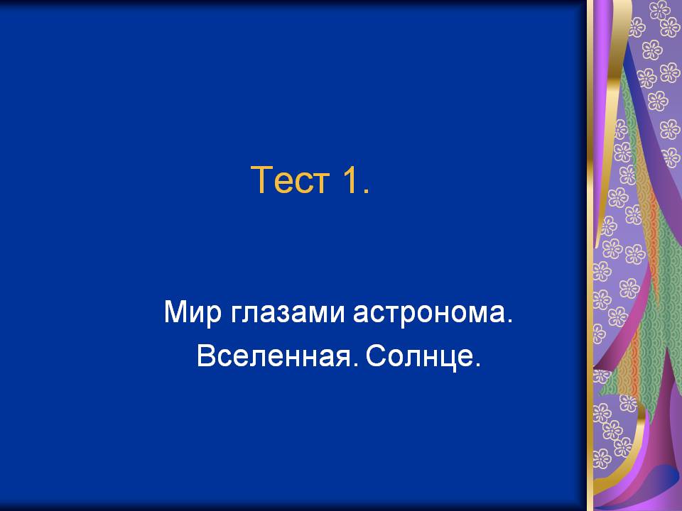 А для того, чтобы проверить, насколько деткам запомнился ваш урок, мы предлагаем вам скачать бесплатно детскую презентацию «Космос, Вселенная, Солнце», которая представляет собой тест из 9 систематизированных вопросов. Результаты теста дадут педагогу представление об уровне знаний учащихся 1-4 класс по пройденному материалу.