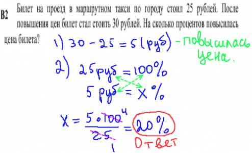 Вначале мы находим на сколько рублей повысилась цена: 30-25=5 рублей. Затем составляем пропорцию, где 25 рублей -это 100%, 5 рублей - это x %. Найдем x по пропорции: x=(5*100)/25=20%.