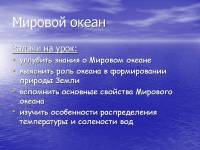 Ученики, посетив такой урок смогут углубить свои познания про Мировой Океан, выяснить какую роль играет океан в развитие природы Земли , тщательно усвоить, какими свойствами обладает океан. В презентации отражены особенности распределения температуры и солености воды в нем. Слайд-шоу «Земля моя» превосходное решение для подробного и увлекательного путешествия на уроке по просторам мирового Океана.