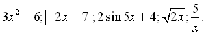Вот примеры некоторых графиков функций: 3x^2-6;abs(-2x-7); 2sin(5x)+4;sqrt(2x); 5/x. Т.е.