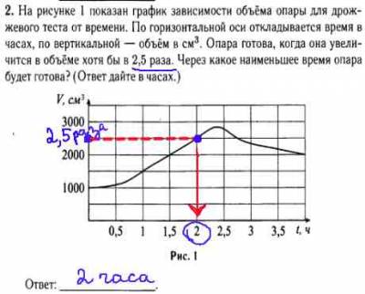 Для решения задачи ГИА по математике из модуля "Реальная математика" мы отмечаем по вертикали точку, когда объем возрастет в 2,5 раза (2500см3), и ведём горизонтальную линию до точки пересечения, получаем 2 часа.