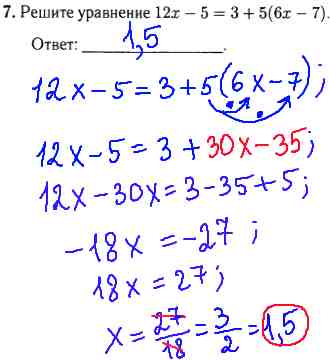 Для решения данного задания гиа по математике (линейного уравнения из модуля "Алгебра") за 9 класс , нужно вспомнить 5 класс. Вначале нужно раскрыть скобки, т.е. умножить 5 на 6х и на (-7). Потом переносим за знак = (равно) числа к числам, иксы к иксам. При этом у переносимых чисел и иксов меняем знаки на противоположные. В итоге, после сокращения, получим ответ 1,5.