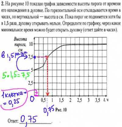 Смотря на решение задания ГИА по математике за 9 класс , видно по графику, что увеличение в 1,5 раза произойдет лишь с 5 см до 7,5 см, т.к. 5*1,5=7,5. По горизонтальной оси, видно что одна клетка - это 0,25. Пересечение с графиком функции произойдет на 3 клетке, т.е.3*0,25=0,75.