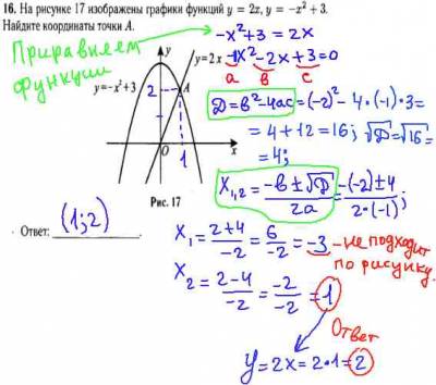 При подготовке к ГИА по математике 2013, очень важно знать, как решать данную задачу 9 класса - модуль "Алгебра". Есть 2 способа решения: 1) через систему уравнений и 2)приравниванием функций. Здесь удобней решать вторым способом. После приравнивания, переносим все слагаемые в одну сторону за знак равно(не забывайте менять знаки слагаемых на противоположные). Решаем квадратное уравнение по дискриминанту, находим 2 корня: - 3 и 1. Но -3 нам не подходит по рисунку. Подставим x=1 в любую функцию, легче в y=2x, т.е. y=2*1=2. Ответ: (1;2).