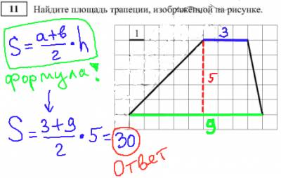 В задаче №11 мы считаем площадь трапеции по формуле: полусумма основнаий, деленная на два и умноженная на высоту h, в ответе запишем 30.
