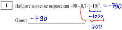В первом задании ГИА 2013 возводим -10 в третью степень - получим -1000, умножим ее на 0,7, тогда будет -90-700=-790.