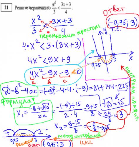 Решим 21 задание ГИА по математике 2013 года из 2 части. Здесь вначале перемножим крест на крест числители и знаменатели данного неравенства. Получим квадратное неравенство, корни которого найдем по дискриминанту. Затем найдем промежуток т.е. решение либо по графику (знак < говорит о том, что решение снизу параболы), либо по промежуткам (знак < говорит что нужно штриховать интервал со знаком минус). В ответе получим, (-0,375; 1,5).