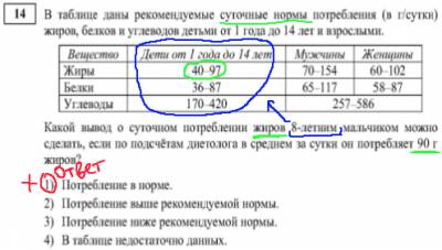 14 задание ГИА 2013 года относится к заданию из модуля "Реальная математика". Здесь нам подойдет 1-ый столбец таблицы, т.к. мальчику 8 лет. Смотрим в таблицу и сравниваем число 90 грамм, которое входит в промежуток 40-97 - т.е. потребление в норме.