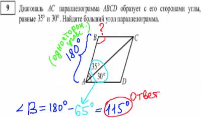 В 9 задаче ГИА по математик из модуля "Геометрия" мы находим больший угол параллелограмма, вспоминая при этом, что сумма односторонних углов будет равна 180 градусов. Т.е. 180°-65°-115°.