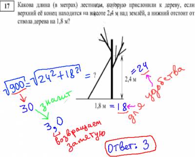 Здесь мы решаем задачу по теореме Пифагора, но вначале смещаем запятую на одну позицию вправо для удобства вычислений. Находим гипотенузу, как сумму квадратов катетов. В ответе получим 30, и обязательно не забываем про запятую, которую смещаем обратно влево, получим 3,0 или просто 3.