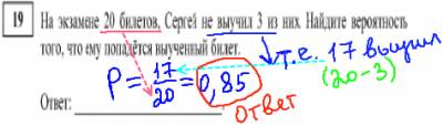 В задании ГИА по математике №19 воспользуемся формулой по теории вероятности, т.е. определнное событие делим на всего, получим 17 выученных билетов делим на 20, т.е. 17/20 или 0,85.