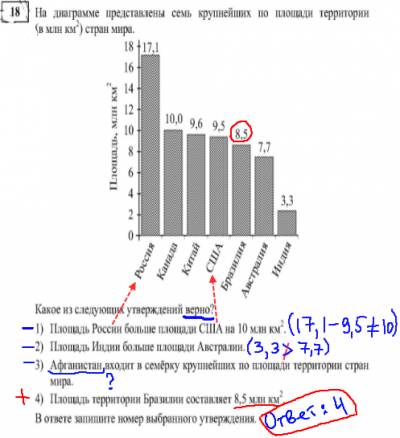 В этой задаче смотрим на столбчатые диаграммы, и видим что действительно. в Бразилии будет 8,5 млн. км?. Правильный вариант ответа 4).