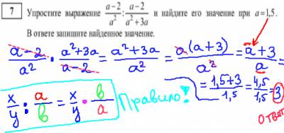 В задании номер 7 на упрощение выражения, мы вначале знак деления заменяем на умножение, а дробь переворачиваем. Сократим a-2, потом в числителе вынесем за скобку переменную a, которую сократим со знаменателем. Останется (a+3)/a, вместо a подставим число 1,5, получим (1,5+3)/1,5=3.