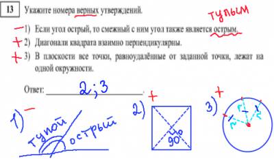 Здесь мы указываем номера верных геометрических утверждений. Первое предложение неверно, т.к. не бывает чтобы два смежных угла были острыми (потому что их сумма должна быть 180 градусов). Во втором утверждении, поставим +, т.к. действительно у четырехугольника с равными сторонами - диагонали взаимно перпендикулярны. Третье тоже верно, т.к. в окружности все точки равноудалены от центра на расстоянии радиуса.