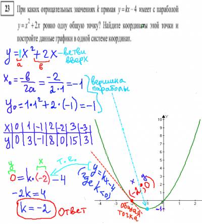 В 23 задании ГИА 2013 из 2 части модуля Алгебра, мы вначале строим график параболы, предварительно найдя координаты вершины и построив таблицу значений. Затем проводим прямую y=kx+b, где k<0 (отрицательный угловой коэффициент, т.е. прямая наклонена влево) так, чтобы была лишь одна общая точка - этой точкой будет точка (-2;0) (выбираем по рисунку). Отсюда подставляем координаты этой точки x=-2 и y=0 в формулу y=kx-4, откуда найдем коэффициент k равный -2.