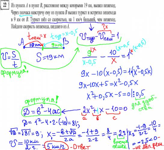 22 задача ГИА - это текстовая задача на путь, скорость и время. Здесь воспользовавшись формулой скорости, составим уравнение. Т.к. скорость туриста больше скорости пешехода на 1 км/ч, то мы должны из большего вычесть меньшее и получить 1. Т.е. Vтур-Vпеш=1. Подставим в формулу пути и время туриста с пешеходом, получим дробное уравнение. Упрощая его, у нас останется квадратное уравнение, решив которое по дискриминанту, время пешехода x будет равно 2 часа. Скорость будет равна 10км:2ч=5 км/ч.