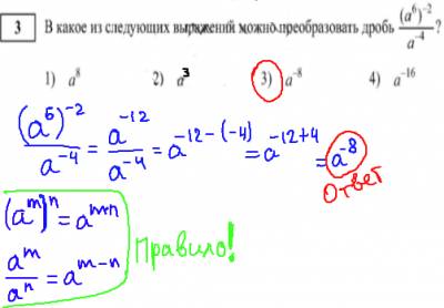 В третьем задании ГИА по математике 2013 вспоминаем правила степеней, и не забываем, что при делении - степени вычитаются.
