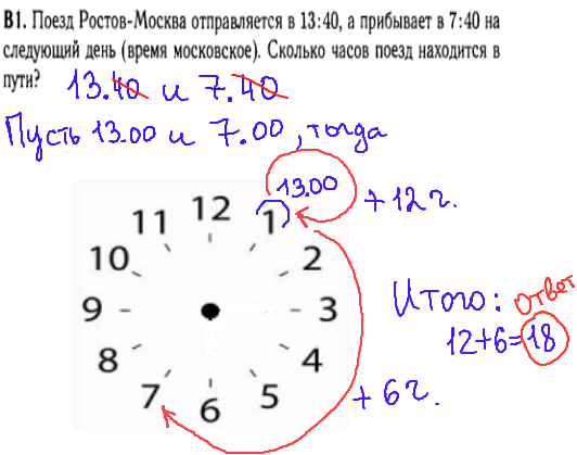 При решении данной задачи ЕГЭ по математике B1 нужно представить себе часы. Все время с 13.40 до 7.40 можно для удобства записать как с 13.00 до 7.00. Понятно, что с 13.00 до 1.00 ночи - пройдет 12 часов, а с часу ночи до 7.00 еще 6 часов. Итого получится 12+6=18 часов.