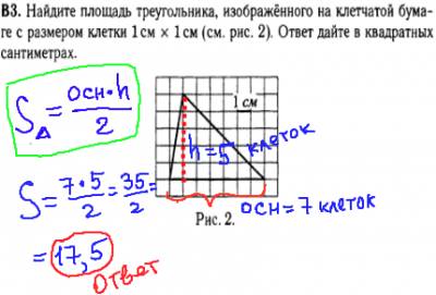 Рассмотрим решение очередной задачи ЕГЭ по математике 2013 - на нахождение площади треугольника, задача B3. Здесь требуется знать формулу площади треугольника S= (основание*высоту)/2. По рисунку видно, что основание 7 клеток, высота 5 клеток. Значит, S=(7*5)/2=17,5.