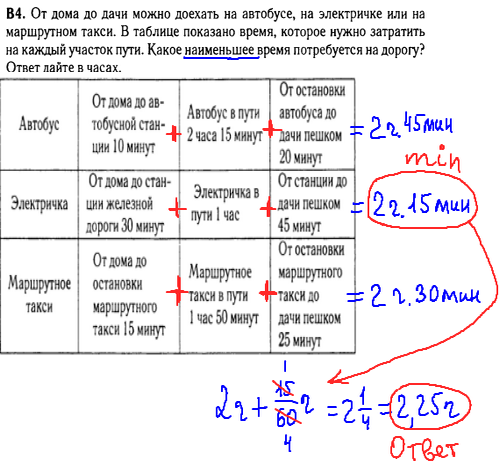 Решим задачу ЕГЭ по математике 2013 под номером B4, которая представляет собой таблицу. В ней просто складываем всё время по строкам. Наименьшее значение в строке и будет ответом. Получили 2 часа 15 минут, а 15 минут это 15/60=1/4=0,25 часа. Итого 2+0,25=2,25 часа. Надеюсь данный разбор задачи поможет многим при подготовке к ЕГЭ по математике.