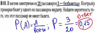 Давайте ознакомимся с решением задачи ЕГЭ по математике 2013 , которая принадлжет к заданиям B10 - "Теория вероятности ". Задача очень простая, главное знать, что вероятность P - это отношение события А на все случаи . Таким образом, вероятность безбилетного пассажира равна 3/20=0,15 .