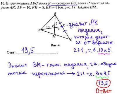При решении данной задачи ГИА по математике (модуль "Геометрия" ), видно что АК - медиана в треугольнике, т.к. точка К делит сторону пополам. К тому же видно, что медиана делится в отношении 2:1, начиная от вершины, т.е. 10 и 5. Следовательно, в точке пересечения еще одна медиана, которая также делится в отношении 2:1, т.е. 9 и 4,5. В сумме BM=9+4,5=13,5.
