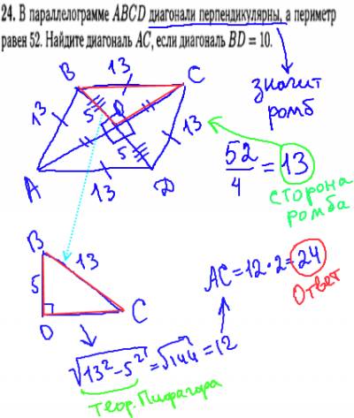 Решая данное задание ГИА по геометрии (на 2 балла), нужно вспомнить, что если диагонали четрырехугольника перпендикулярны, то все его стороны равны, значит параллелограмм будет ромбом. Следовательно, диагональ BD делится пополам по 5. Таким образом, рассмотрим прямоугольный треугольник BOC и найдем сторону (полудиагональ) по теореме Пифагора: OC=12, значит вся диагональ AC=12*2=24.