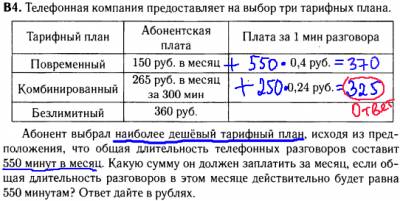 В задаче мы считаем сумму по каждой строке, т.е. абонентская плата+плата за 1 мин разговора. В 1-ой строке берем ровно 550 минут, как по условию. Во 2-ой строке 250 минут, т.к. 300 минут уже израсходовано в счет абонентской платы (550-300=250 осталось). Перемножаем и складываем, получим 325 рублей - самый дешевый тариф.