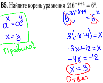 Вначале представим число 216, как 6 в третьей степени. Шестёрки сокращаем, остаются только степени, которые мы приравниваем. Решаем полученное уравнение и находим x равное 3.
