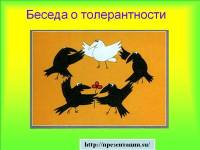 В 14 красочных слайдах ребята увидят примеры толерантного отношения друг к другу, научатся понимать и проявлять уважение к непохожему и чужому мнению, станут более вежливее в общении с собеседниками. Скачайте детскую презентацию для использования в беседах на классных часах, на уроках этики, внеклассных мероприятиях и т.д.