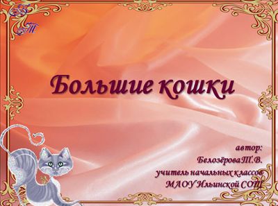 В данной мультимедиа разработке рассказывается про семейство кошачьих, об их повадках и образе жизни, а также о самых крупных представителях кошек: льве, тигре, гепарде, леопарде. В конце детской презентации дается небольшой тест для проверки усвоенной темы - "большие кошки". Презентация является научно-познавательной, и пригодится учителям для проведения урока по окружающему миру.