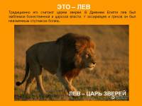В презентации рассказывается, почему льва называют царь зверей , говорится о строении, образе жизни, характере и повадках львов . Благодаря красивым и качественным фото со львами, дети окунуться в мир дикой природы, увидят разные виды львов, узнают, что львы живут прайдами - небольшими семьями. Детская презентация будет полезна детям на уроках окружающиего мира и биологии.