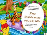 В бесплатной powerpoint презентации ребятам вместе с героями мультфильма винни-пух нужно найти как можно быстрее числа от десяти до ста. Благодаря данной презентации у детей формируется внимание и быстрота реакции.