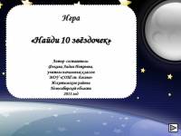 В powerpoint презентации детям предстоит найти десять звезд на небе, по которым можно щелкнуть мышкой. Чем быстрее ребенок найдет все звезды, тем лучше. Данная презентация формирует у маленьких детей зрительную память, быстроту реакции, внимание.