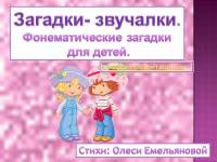 В детской презентации используются стихи Олеси Емельяновой, которые сопровождаются красочными рисунками, а в словах стихов различными цветами выделены слоги , которые являются ответом на загадки .