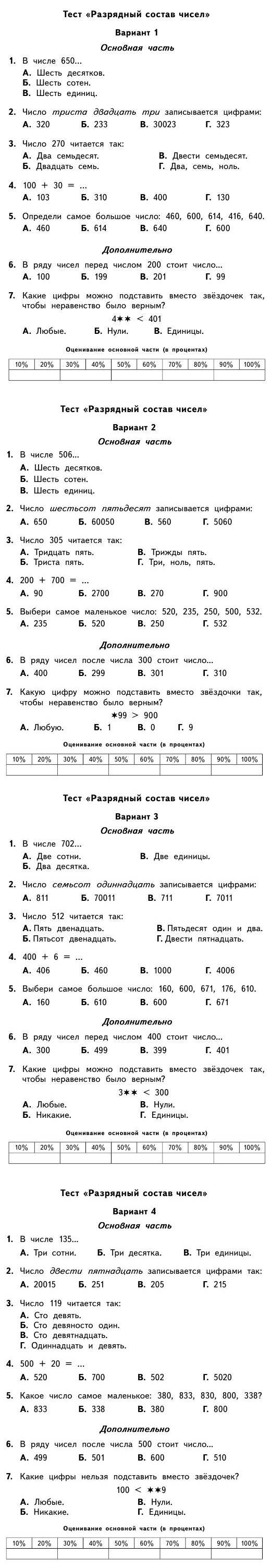 Разрядный состав чисел ". Тест содержит 4 варианта и состоит из 7 типовых тестовых заданий.