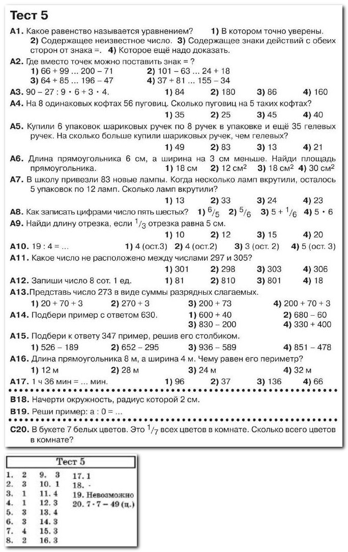3 класса". Тест номер 5 создан в форме ЕГЭ, содержит 20 заданий и состоит из 3 частей А, В, С. В конце заданий есть ответы для проверки годовых знаний учащихся за 3 класс.