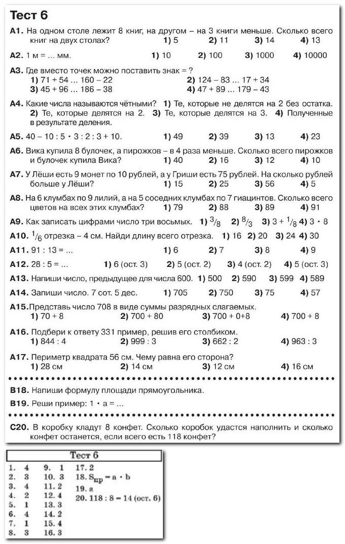 3 класса". Тест номер 6 создан в форме ЕГЭ, содержит 20 заданий и состоит из 3 частей А, В, С. В конце заданий есть ответы для проверки годовых знаний учащихся за 3 класс.