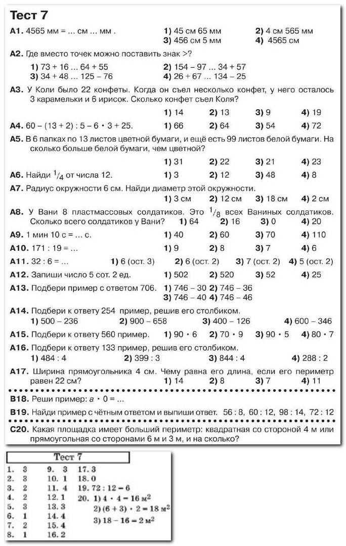 3 класса". Тест номер 7 создан в форме ЕГЭ, содержит 20 заданий и состоит из 3 частей А, В, С. В конце заданий есть ответы для проверки годовых знаний учащихся за 3 класс.